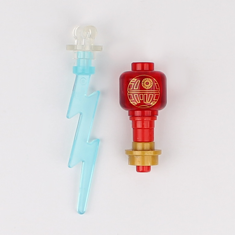 Includes Custom Printed Cape with interior lining, 1x Printed Trans-Red Head with Hologram Projector base and 1x Lightning Piece with 1x1 Stud and Bar attachment.